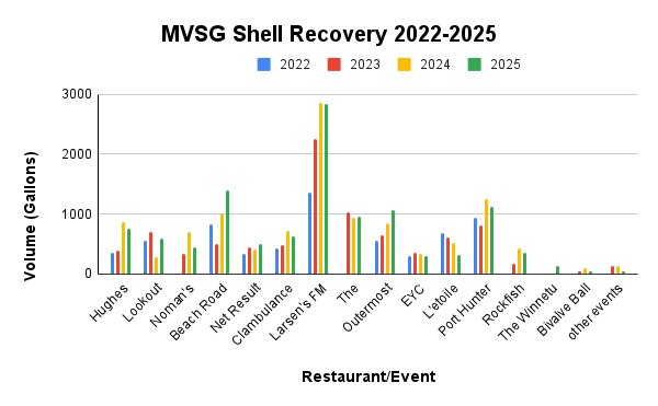 The Martha’s Vineyard Shell Recovery Partnership is a program of the Martha’s Vineyard Shellfish Group, Inc. and was created in 2011 under the initiative of a former hatchery staffer, Jessie Holtham. At the time, Mrs. Holtham was a manager of a busy restaurant serving high volumes of raw and cooked shellfish. She watched shells fill dumpsters at her place of work and knew how badly it was needed for shellfish habitat restoration. She formulated a shell pick-up program with these goals: